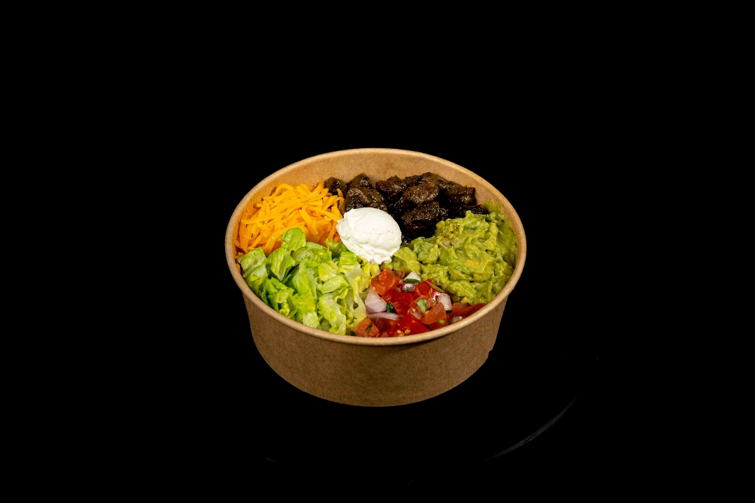 Carne asada + smashed avocado (optional) + pico de gallo + shredded cheddar cheese + black beans + crisp romaine + white or brown cilantro rice + sour cream. 49g of protein.