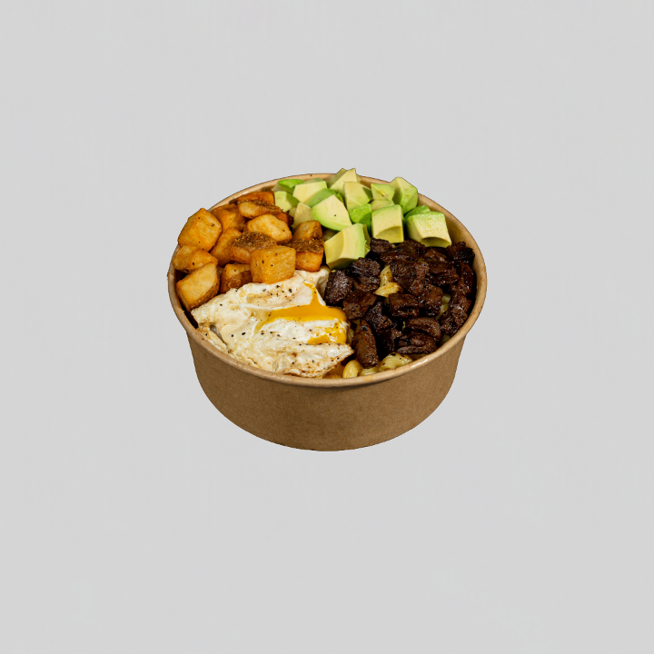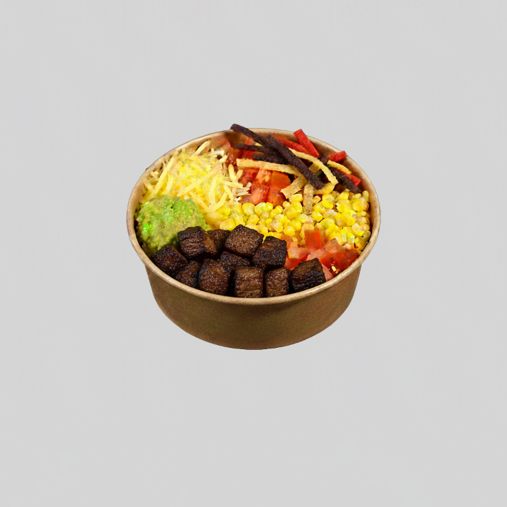 Marinated steak bites + smashed avocado (optional) + tortilla strips + shredded cheddar cheese + sautéed red onions + cooked corn + diced Roma tomatoes + black beans + white or brown cilantro rice + sauce of your choice on the side. 49g of protein.