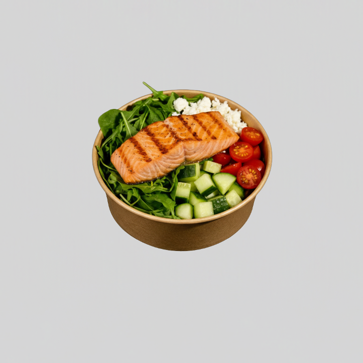 Grilled salmon + feta cheese curds + cherry tomatoes + fresh cucumber + baby arugula + baby spinach + white or brown cilantro rice + house made balsamic vinaigrette on the side. 36g of protein.