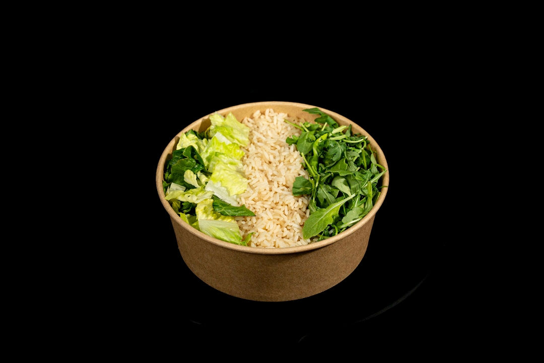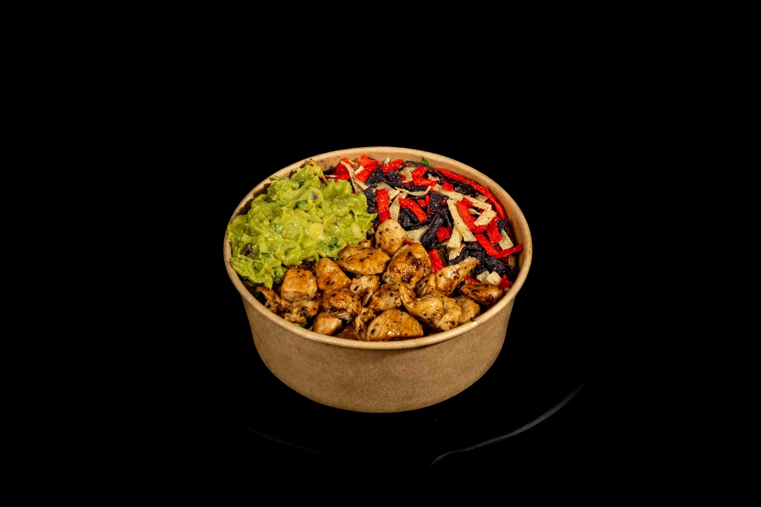 Grilled chicken breast + smashed avocado (optional) + tortilla strips + golden corn + black beans + diced Roma tomatoes + diced red onions + crisp romaine + white or brown cilantro rice + house made cilantro cumin lime vinaigrette (mixed in). 43g of protein.